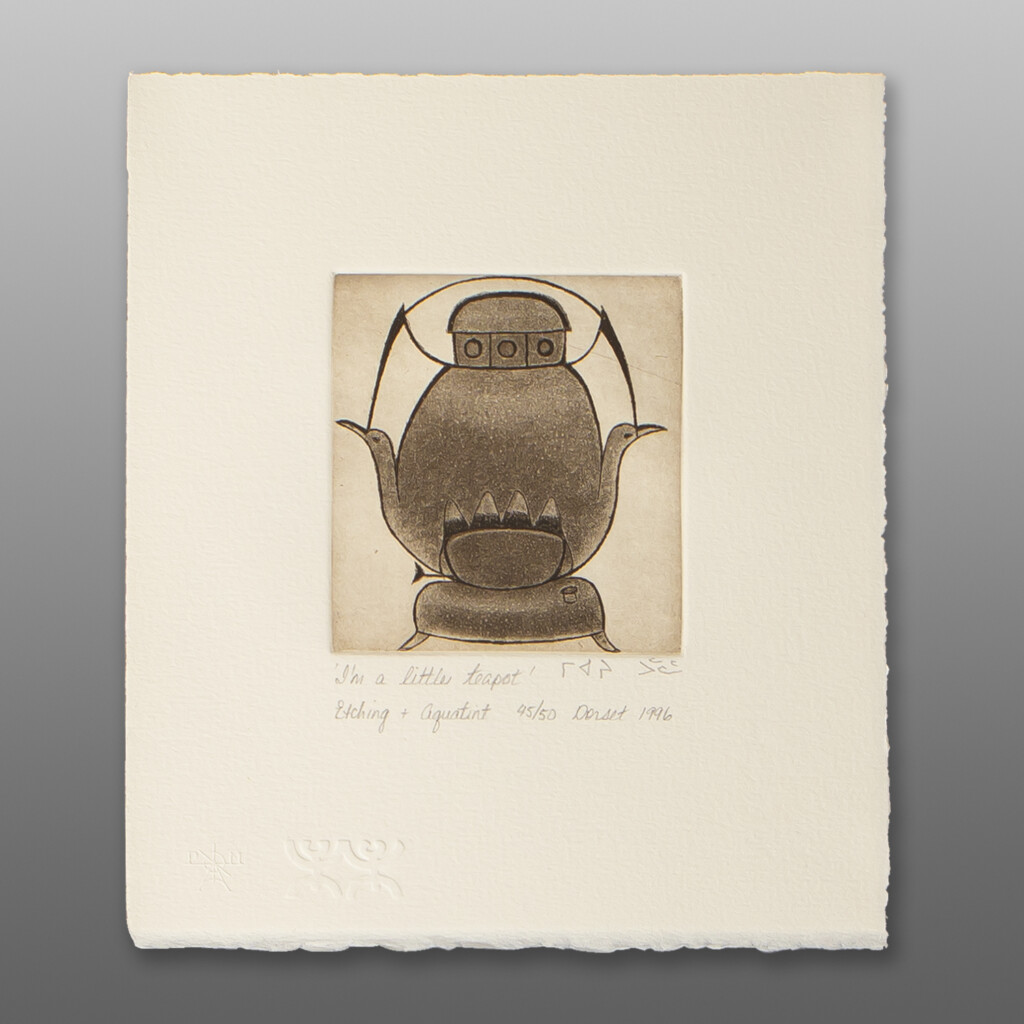 I'm a Little Teapot (1996)Mary Pudlat InuitEtching & aquatint 8¼" 9½"300 About Mary Pudlat $300.00Add to cart More Rare Inuit Prints Looking Out from the Tent (1980)Ikayukta TunnillieSold Contest for a Mate (1990)Mabel NigiyokSold Two Polar Bears (1977)Sarah Putuguk300 Qulaujaktuk – Drummer (1997)Andrew QappikSold OwlR. LarkSold Searching for Their Evening Meal (1978)Sarah PutugukSold Tulukanyartuq (1997)Annie Pitsiulak300 Two Fighting Ravens With Young (1978)Isah Papialuk400 Flock of Swans (1979)Sorosiluto AshoonaSold Caribou Walking (1981)Simiuni SivuarakpikSold