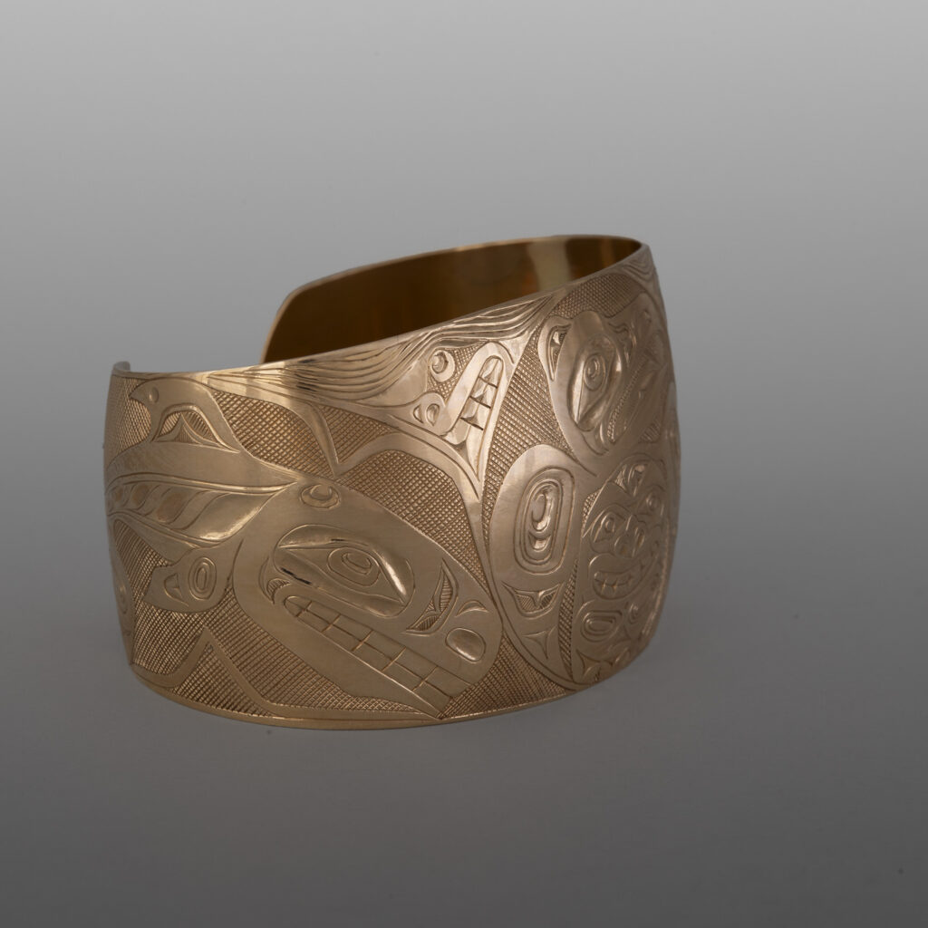 Orcas of the Raven Clan Bracelet Kelvin Thompson Salteaux14 karat gold 5¾" x 1½"9,000 About Kelvin Thompson More Bracelets Lovebirds BraceletLloyd Wadhams Jr.1,950 Orcas of the Raven Clan BraceletKelvin Thompson9,000 Hummingbird Pair BraceletKelvin Thompson6,000 Northern Owl BraceletAllen Thompson1,600 Humpback Whales BraceletAllen Thompson1,500 Octopus & Crab BraceletAllen Thompson1,500 Hummingbirds BraceletAllen Thompson 1,500 Heiltsuk Weave BraceletDean HuntSold Killer Whale Pod BraceletLandon Gunn1,800 Eagle & Human BraceletCorey MoraesSold