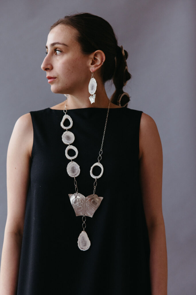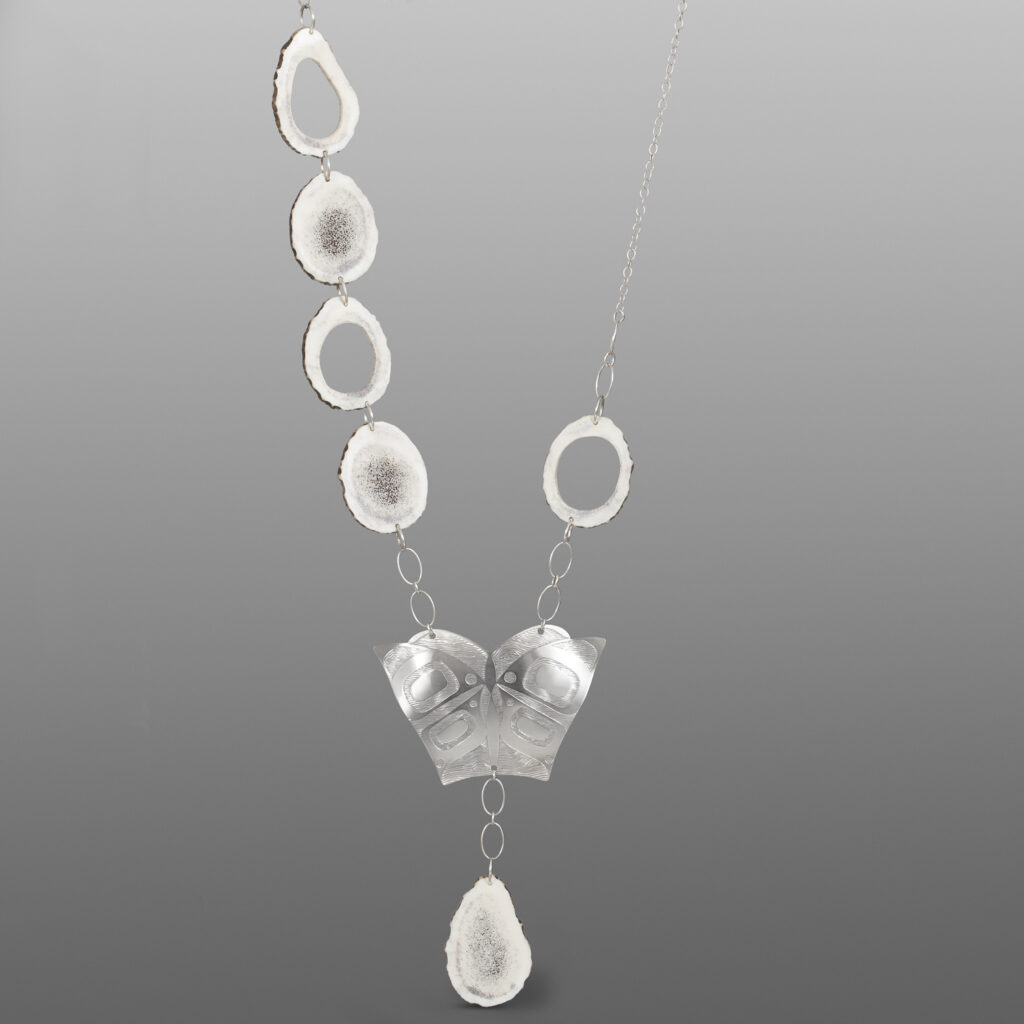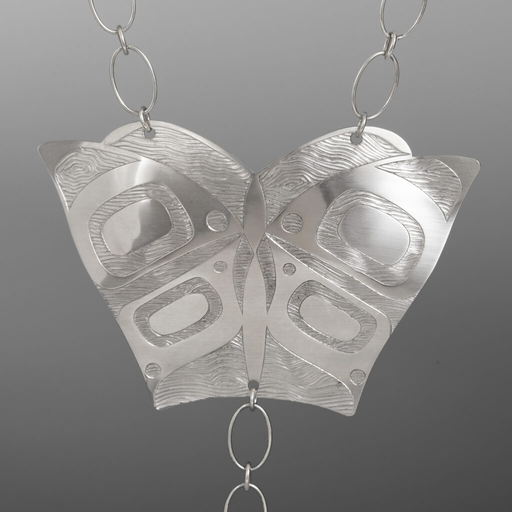 Wood Grain Butterfly Necklace Jennifer Younger TlingitSterling silver, antler 3¾" x 2½", 32" chainSold About Jennifer Younger More by Jennifer Younger Abundance, Renewal, HopeJennifer Younger$6500 Metamorphosis Tin’aa Jennifer YoungerSold Wildrose NeckplateJennifer Younger$2800 Mondrian-style Butterflies Jennifer YoungerSold Layering Necklace Jennifer YoungerSold Devilfish Tin’aa NecklaceJennifer YoungerSold Devilfish (Octopus) ChestplateJennifer Younger$3500 Red Copper Tinaa PendantJennifer YoungerSold Wild Rose EarringsJennifer YoungerSold Salmon EarringsJennifer YoungerSold