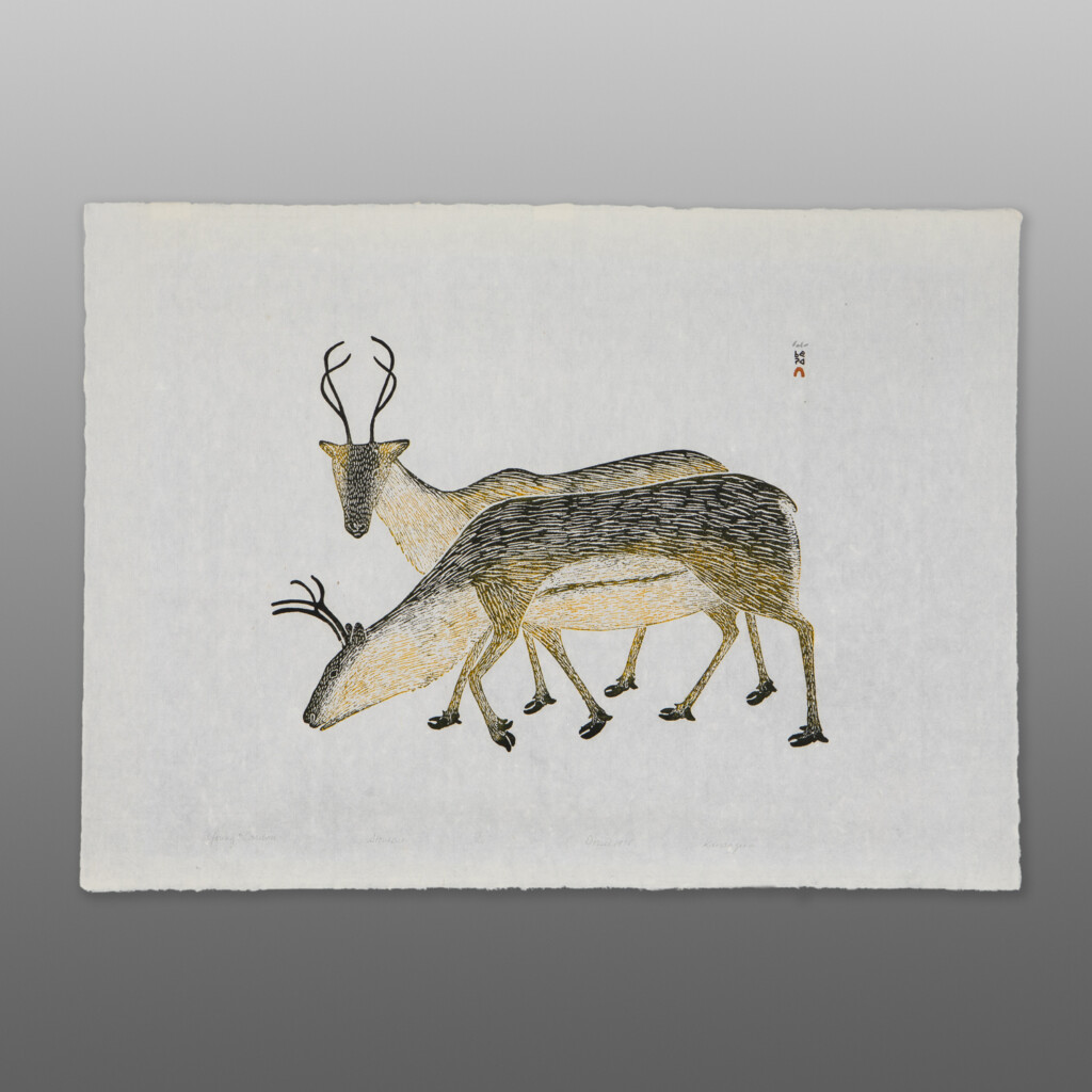 Young Caribou (1975)Kananginak Pootoogook (1935 - 2010) InuitStonecut 34" x 25"1,400 About Kananginak Pootoogook $1,400.00Add to cart More Rare Inuit Prints Looking Out from the Tent (1980)Ikayukta TunnillieSold Contest for a Mate (1990)Mabel NigiyokSold Two Polar Bears (1977)Sarah PutugukSold Qulaujaktuk – Drummer (1997)Andrew QappikSold OwlR. LarkSold Searching for Their Evening Meal (1978)Sarah PutugukSold Tulukanyartuq (1997)Annie PitsiulakSold Two Fighting Ravens With Young (1978)Isah Papialuk400 Flock of Swans (1979)Sorosiluto AshoonaSold Caribou Walking (1981)Simiuni SivuarakpikSold